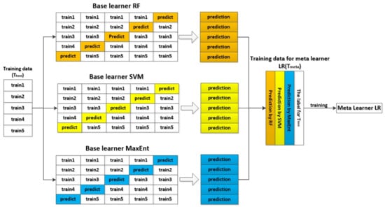 Unlike the other two types of ensemble learning methods, SELM uses a meta-learning technique to combine different types of algorithms. The structure of the SELM framework consists of two levels. The first level is similar to a highly complex non-linear variable converter, and then, the instances have new features after this conversion; therefore, the second level does not require complex classifiers. Logistic regression (LR) was recommended by previous researchers []. The process of the stacking method is as follows: