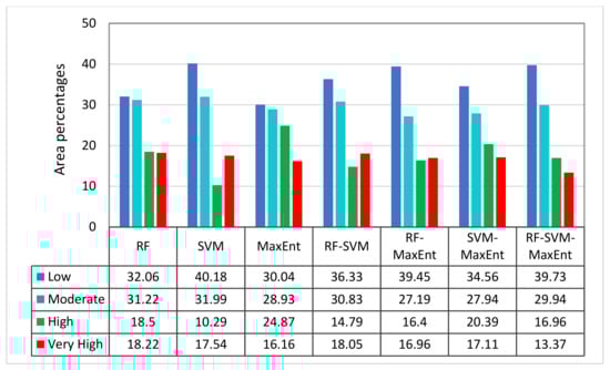 For better visualisation and understanding of the overall spatial pattern of the distribution of Au deposits, the probability was reclassified into four levels: low, moderate, high, and very high by using the concentration–area (C-A) fractal method. Then, mineral prospectivity maps by different methods were obtained, as shown in Figure 7; Figure 8 shows the percentages of different levels in different methods and their ensembles.