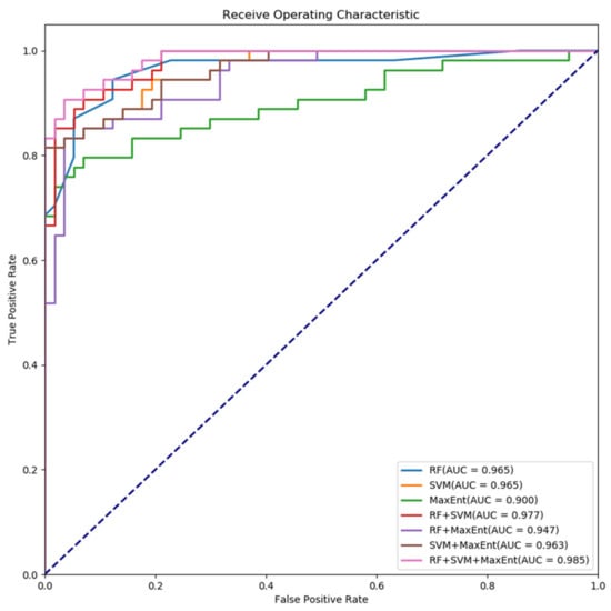 The ensemble learning methods of RF–SVM–MaxEnt showed better performance than the base classifiers, and it achieved the highest overall accuracy value of 0.928, followed by RF (0.910), RF and SVM (0.901), SVM and MaxEnt (0.859), SVM (0.856), RF and MaxEnt (0.829), and MaxEnt (0.823), respectively.