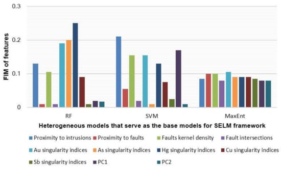 The feature importance measures (including influencing geologic features, geochemical singularity indices, and PCs) can be quantified based on the contribution of each feature to the final prediction by the different base models (Figure 10); therefore, heterogeneous modelling results may be interpreted to some extent.