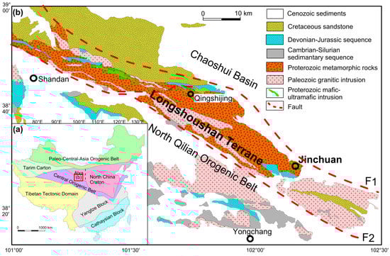 (a) The location of the study area and (b) a simplified geological map of the Longshoushan terrane. Both subfigures are based on [,].