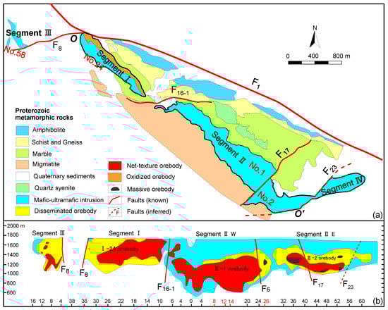 The ore bearing ultrabasic rock bodies unconformity intrudes into the Baijiazuizi formation of pre-Great Wall system, which is in direct contact with gneiss, marble and banded migmatite, in the form of wall. It is about 6500 m long, 20–527 m wide on the surface (Figure 2a) and has a southwestern downward extension of more than 1000 m from the ground surface (Figure 2b) []. The overall strike is N50° W, inclined to the SW, with a dip angle of 50°–80°. The rock mass area is about 1.34 km2. The ultramafic intrusion is divided into four sections by F8, F16-1, and F23 and is numbered as III, I, II, and IV from west to east (Figure 2a), which are corresponding to the four mining areas, respectively. The three main ore bodies with proved reserves of great economic value are respectively hosted in No.1 and No.2 ore bodies of Segment II and No.24 ore body of Segment I, and No.58 ore body is hosted in an independent rock body in the southwest side of Segment III (Figure 2b).