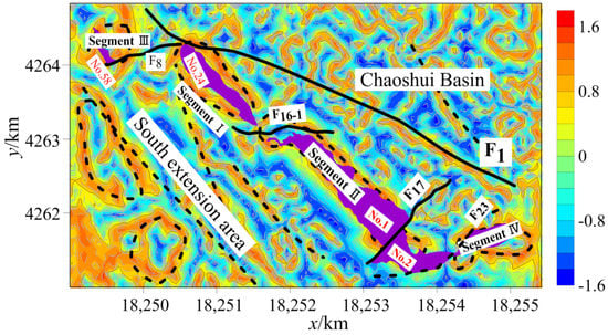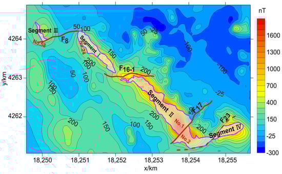 Convenient and efficient aeromagnetic exploration has been carried out in the main mining area. The aeromagnetic work uses the power glider as the carrier, and the measuring instrument is the helium optical-pumping magnetometer with a sensitivity of 0.001 nT. The average flight height is 93 m, the measurement scale is 1:10,000, the distance between survey lines is 100 m, and the distance between points is 2.7–3 m. The maximum dynamic noise level of the survey line in the survey area is 0.052 nT, most of which is less than 0.04 nT, and the average value is 0.027 nT, meeting the measurement requirements. Reduction to the pole can eliminate the asymmetry of the magnetic anomaly position caused by the declination and inclination of the magnetization field. After reducing magnetic anomaly to the pole, the anomaly information is more abundant, including the anomalies of different properties, scales, and depths. It is the basic data for anomaly interpretation. The induced magnetization of ultrabasic rocks and ores with high magnetic susceptibility in the Jinchuan Cu–Ni mining area is obviously greater than the residual magnetization [], so reduction to the pole can be carried out, and the result is shown in Figure 3. The negative aeromagnetic anomaly of the mining area is located in the northeast, the isoline is relatively disordered, and the minimum negative anomaly is less than-140 nT. The positive aeromagnetic anomaly is mainly located in the southwest and central part, showing a significant northwest distribution. The known mining areas III, I, II, and IV (magenta curve range in Figure 3) are all in the high positive aeromagnetic anomaly area. The high positive anomaly in the III mining area is nearly circular, with a diameter of about 750 m, an area of about 0.4 km2, and a maximum anomaly intensity of more than 350 nT. The high positive anomaly in the I mining area extends northwestward in a belt, with a length of about 1400 m, a width of about 600 m, and an area of about 0.75 km2. The maximum anomaly value is located in the southeast end of the mining area, and the maximum anomaly value is more than 600 nT. The two ends of the high normal abnormal morphology in the II mining area have obvious distortion, but generally it is a strip extending northwestward, with a length of about 3000 m, a width of about 900 m in the west section, a width of about 650 m in the east section, an area of about 2.23 km2, and the maximum abnormal value is more than 1500 nT. In addition, the cascade zones on both sides of the I and II mining areas are relatively steep, showing the characteristics of steepness in the northeast and slowness in the southwest, suggesting that the abnormal body is steeply inclined to the southwest. The corresponding high positive anomaly of the IV mining area has a irregular ellipse shape, with long axis in east-west direction, about 1000 m long, 850 m wide, and an area of about 0.75 km2. Combined with the geological map and the characteristics of physical parameters of rocks and ores, the high positive aeromagnetic anomaly in the mining area is mainly caused by the ore bearing ultrabasic rocks, so the high positive aeromagnetic anomaly is an important indicator of ultrabasic rocks.