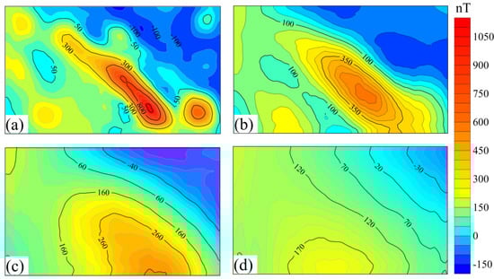 Multiscale separation results (a–d) of the aeromagnetic anomaly in Figure 3 using a dual-tree complex wavelet.