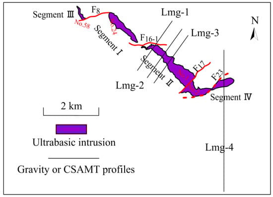 On this basis, we use the gravity and CSAMT data to acquire the locations of the deep potential ore-bearing rock masses in the II and IV mining areas, and the locations of the survey lines are shown in Figure 6. The profiles of gravity and CSAMT data are designed according to the characteristics of magnetic anomalies and the structure of the mining area. The direction of profile Lmg1~3 is 38.38° and that of Lmg4 is 0°. The parameters of CSAMT measurement of the four profiles are determined according to the proposed exploration depth. The minimum receiving and transmitting distance is 12 km, and the maximum is about 16 km. The power supply electrodes are arranged parallel to the survey line, the electrodes distance is 2 km, and the azimuth error is less than 3°. The sampling frequency is 1–9600 Hz, and there are 41 sampling frequency points. The station distance is 50 m. The quality inspection of the CSAMT measurement adopts the method of data observation on the inspection point again. The data quality evaluation is to calculate the mean square relative error of the resistivity of the inspection point. The mean square relative error of the resistivity of the single point in this work is 1.3–4.9%, which meets the specification and design requirements of less than or equal to 5%. The scale of gravity profile (Lmg-1 and 4) work is 1:5000, and the distance between profile points is 20 m. The instrument used is a CG-5 high-precision gravimeter with a reading resolution of 1 μgal. Before field operation, in addition to various checks and adjustments, static and dynamic tests are carried out to ensure the good performance of the gravimeter in use. The total mean square error of the Bouguer gravity anomaly is ±0.079 × 105 m/s2, which meets the design requirements and has reliable quality.
