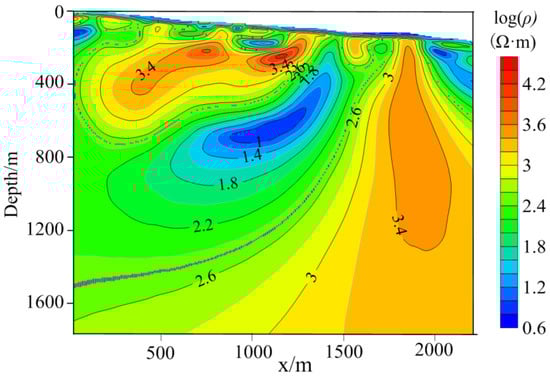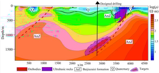 Figure 11 is the inversion results of gravity and aeromagnetic anomalies based on the SL0 algorithm. The corresponding positions in the middle and lower parts of the profile have obvious large high-density and high-magnetic anomaly areas, and they all have the characteristics of extending to the upper left. The inversion result of CSAMT shows that the resistivity on the right side of the profile is relatively high, the resistivity in the middle is relatively low, and that their contact zone changes from steep to slow towards the deep (Figure 12). Compared with the inversion results in Figure 11, it was found that the high-density and high-magnetic area is consistent with the middle medium-low resistivity area. The inversion results are interpreted in combination with a geological map, the results of a nearby geological exploration line, and the physical parameters of the rocks. It can be seen that the shallow low-density, low-magnetic and low-resistivity areas of the profile are mainly caused by the Quaternary, while the high-resistivity area on the right side is the reflection of Baijiazuizi formation, the high-density, high-magnetic, and low-resistivity area in the upper part of the contact zone corresponds to the known ore-bearing ultrabasic rocks in the four mining areas. At the same time, it is inferred that the transition zone is a fault zone (red dotted line on the right side of Figure 12), which is the channel for ultrabasic magma to intrude into Baijiazuizi formation. Based on the geophysical prospecting model and metallogenic law, we speculate that the deep high density, high magnetism, and medium-low resistivity area in a large range near the channel is the favorable target area for prospecting, and the location is roughly within the survey line 2600–3200 m and its buried depth is 1200–1700 m. At the same time, the drilling hole location is designed, as shown in Figure 12.