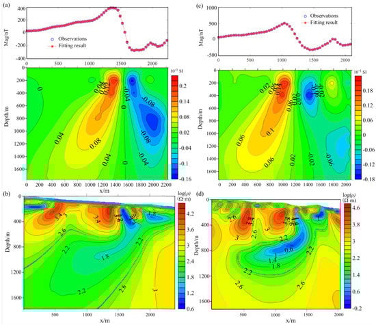 Inversion results of the aeromagnetic (a) and CSAMT (b) data of Lmg-2, and the inversion results of the aeromagnetic (c) and CSAMT (d) data of Lmg-3.