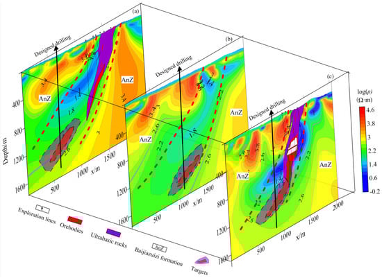 Combined with the geological map, the petrophysical properties of the study area and the results of the known exploration profiles, it is obvious that the high resistivity, low density, and low magnetism areas on both sides of the profiles are caused by the Baijiazuizi formation, the shallow medium-low resistivity, high density, and high magnetism areas are caused by the ore-bearing ultrabasic rock masses, and the transition zone on both sides of the middle abnormal area are the fault zones where ultrabasic rocks intrude into Baijiazuizi formation, as shown by the red dotted line in Figure 10. At the same time, we can see that the single geophysical method has limitations. For example, the resolution of CSAMT in the deep of the profile is insufficient, and it cannot clearly indicate the location of the deep abnormal target body. Therefore, we have roughly determined the target locations based on the high-density, high-magnetism, medium-low-resistivity geophysical exploration model, and the metallogenic law that is easy to form ore at a low-lying structure place, and we have inferred that the favorable metallogenic location of the line Lmg-1 is about 400–900 m and the burial depth is about 1100–1500 m, the favorable metallogenic area of the line Lmg-2 is about 800–1300 m and the burial depth is about 1200–1700 m, and the favorable metallogenic area of the line Lmg-3 is about 500–1000 m and the burial depth is about 1000–1500 m. The approximate location of the target body is shown by the black dotted line in Figure 10, and three drilling verification locations are designed.