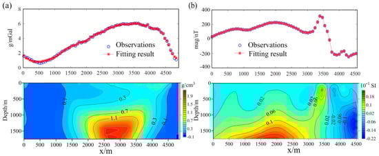 Inversion results of the gravity (a) and aeromagnetic (b) data of Lmg-4.
