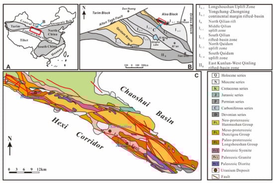 (A) The main geotectonic units of China with the location of the Longshoushan Metallogenic Belt (LMB). (B) A geological map of northwest China showing the main tectonic units (modified after [41]. (C) A regional geological map of Longshoushan Metallogenic Belt (LMB), showing the locations of the two sodium metasomatic type deposits (the Jiling and Xinshuijing uranium deposits) and pegmatite uranium deposit (Hongshiquan uranium deposit) (modified after [42]).