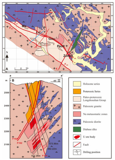 - Zhong, J.; Wang, S.Y.; Gu, D.Z.; Cai, Y.Q.; Fan, H.H.; Shi, C.H.; Hu, C.N. Geology and fluid geochemistry of the Na-metasomatism U deposits in the Longshoushan uranium metallogenic belt, NW China: Constraints on the ore-forming process. Ore Geol. Rev. 2020, 116, 103214. [Google Scholar] [CrossRef]
