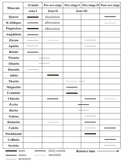 In the Jiling uranium deposit, the common type of alteration is represented by albitization developed at the expense of Jiling granites. Na metasomatic zones are generally massive or brecciated rocks strongly controlled by faults. The primary textures of granites are generally preserved but may also be modified during later alterations. The alteration characteristics of the Jiling uranium deposit have been already described [10,14,44]. In this study, we identified three zones (I, II, III) defined by their mineralogical assemblage as developed in Jiling granite (Figure 3). Zone I corresponds to the least altered host granites, part of biotite, feldspars, magnetite, and local allanite were replaced by chlorite and ilmenite. These minerals probably formed later compared to quartz dissolution and albitization, which have to occur at high temperatures according to the crystallization of Th-REE-rich uraninite as discussed thereafter, with a limited new formation of quartz.