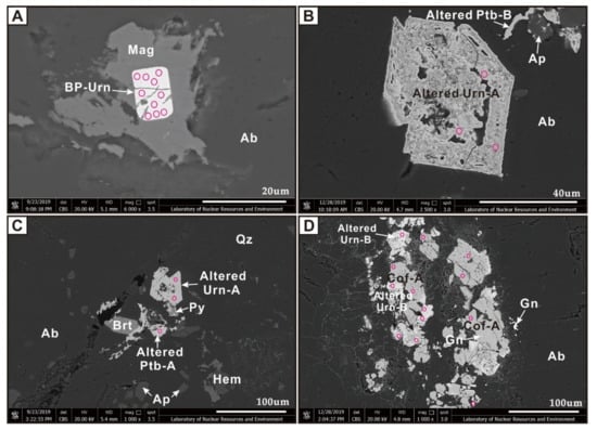 Backscattered electron (BSE) images of the best preserved uraninite (BP uraninite) crystal and altered uraninite A and B in the Jiling uranium deposit. (A) The BP uraninite crystal coexisting with magnetite and associated with albite. (B) Altered uraninite A associated with albite, altered pitchblende B and apatite are nearby (C) Altered uraninite A associated with albite and pyrite, altered pitchblende A, barite, hematite, and apatite are nearby. (D) Altered uraninite B preserved in the core or at the margin of coffinite grains (coffinite A), and coexisting with galena. Ab—albite; Ap—apatite; Brt—barite; Cof—coffinite; Gn—galena; Hem—hematite; Mag—magnetite; Ptb—pitchblende; and Urn—uraninite. Red circles indicate the location of electron microprobe analyzer (EMPA) datapoints.