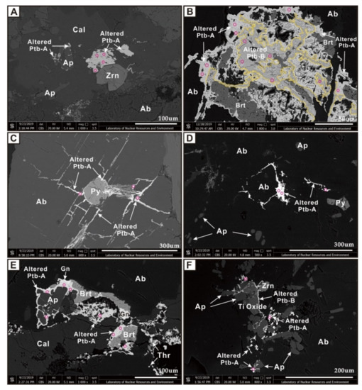 Pitchblende occurs as: (1) disseminated along the space between albite, co-precipitated with calcite, and infilling in some microfractures of apatite (Figure 5A); (2) disseminated along the fracture of albite (Figure 5B); (3) infilling along microfractures of albite, and coating around pyrite and albite crystals (Figure 5C,D); (4) calcite followed by pitchblende along microfractures in apatite, and as a colloidal pitchblende cement around apatite, calcite, and baryte; (Figure 5E); and (5) infilling around early apatite and titanium oxide crystals (Figure 5F).