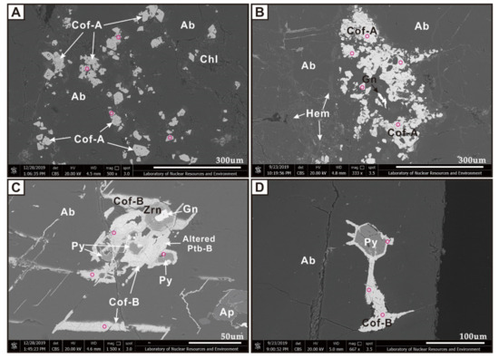 Backscattered electron (BSE) images of coffinite A and coffinite B in the Jiling uranium deposit. (A) Coffinite A occurs as independent mineral grains in the albite and coexisting with chlorite. (B) Coffinite A crystal aggregates filling fractures in albite with galena, hematite dissemination in albite in its vicinity. (C) Coffinite B and altered pitchblende B around zircon and pyrite crystals and as veinlet infilling, galena in the core of a zircon crystal. (D) Coffinite B filling microfractures of albite and rimming a pyrite crystal. Ab—albite; Ap—apatite; Brt—barite; Cof—coffinite; Chl—chlorite; Gn—galena; Hem—hematite; Ptb—pitchblende; Py—pyrite; Zrn—zircon. Red circles indicate the location of EMPA datapoints.
