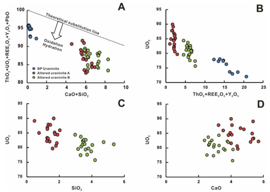 Compared to the BP uraninite crystals, the altered uraninite A and B typically exhibited low contents of ΣThO2 + UO2 + REE2O3 + Y2O3 + PbO and high contents of ΣCaO + SiO2 (Figure 7A). Low contents of ΣCaO + SiO2 in BP uraninite suggested that these elements were not significantly incorporated into the crystal structure of uraninite during its crystallization and that the crystals have not been significantly altered. There was a negative correlation between these three types of uraninite groups in the plot of ΣThO2 + REE2O3 + Y2O3 vs. UO2 (Figure 7B).