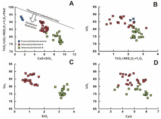 The three fresh pitchblende analyses also had low SiO2 and CaO contents, and relatively high and constant PbO contents. Based on the textures and compositions, most of the pitchblende in the Jiling uranium deposit also underwent post mineralization hydrothermal alteration with two types. Compared to fresh pitchblende, altered pitchblende A and B had slightly lower contents of ΣThO2 + UO2 + REE2O3 + Y2O3 + PbO and clearly higher contents of ΣCaO + SiO2 (Figure 8A). Altered pitchblende B had lower ΣThO2 + UO2 + REE2O3 + Y2O3 + PbO, UO2 and higher ΣCaO + SiO2, ΣThO2+REE2O3+Y2O3 contents than altered pitchblende A (Figure 8A,B), suggesting that altered pitchblende B has underwent more intense alteration than altered pitchblende A.