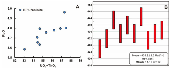 Estimation of the crystallization age of uraninite from chemical dating are given in Table 2, with a 1σ uncertainty. As described above, the BP uraninite crystals showed extremely low Si and Ca contents, high and relatively homogeneous Pb contents, illustrating that BP uraninite crystal did not suffer significant alteration since its crystallization. The U-Th-Pb chemical ages obtained from these uraninite ranged from 426 Ma to 445 Ma (Table 2), with a weighted mean age of 435.9 ± 3.3 Ma (n = 10, MSWD = 1.1) (Figure 9b).