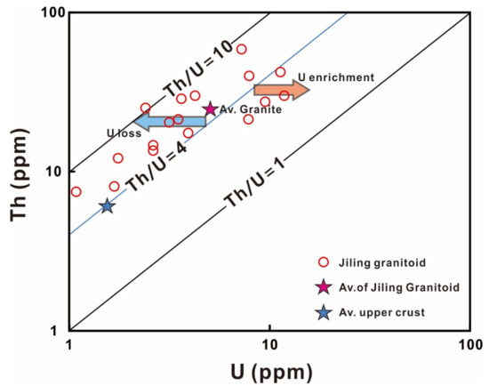 Th vs. U diagram of the Jiling granitoids showing their U and Th enrichment relative to the average upper crust and average granite. Most samples exhibited U depletion compared to the average crust ratio of 3.9.