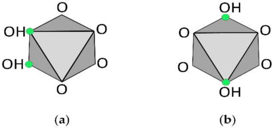 where M+ represents the exchangeable interlayer cations; R2+ and R3+ refer to divalent and trivalent octahedral cations, respectively; x and y indicate the tetrahedral and octahedral layer charge, respectively [2]. The most important species of dioctahedral smectites are montmorillonite, beidellite, and nontronite. In general, octahedra shows two different configurations related to the disposition of hydroxyl groups, for example, cis- and trans-octahedron. In the cis-octahedron, the OH groups are on the same side, whereas in the trans-octahedron, the OH groups are on the opposite side (Figure 2).