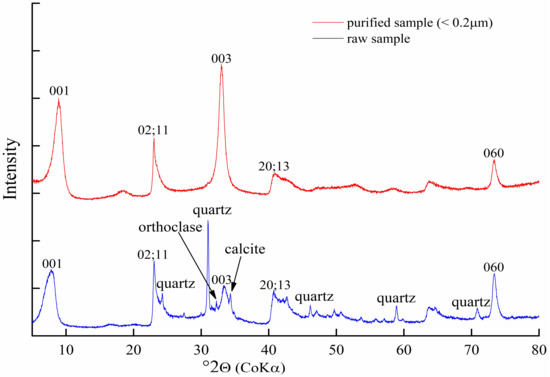 - Moore, D.M.; Reynolds, R.C., Jr. X-ray Diffraction and the Identification and Analysis of Clay Minerals, 2nd ed.; Oxford University Press: New York, NY, USA, 1997; pp. 335–339. [Google Scholar]