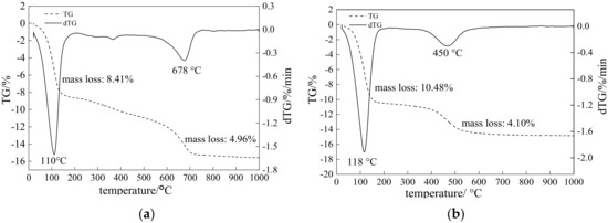 Figure 5 shows the thermal behavior of samples with mainly cv and tv configurations. The dehydration of both samples was at around 120 °C. The dehydroxylation temperature of the samples with mainly cv structure was around 700 °C and the sample with mainly tv structure was around 500 °C, which agreed well with previous studies [7,8,28,29].