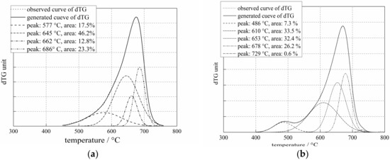 Six samples were classified as tv varieties (Table 4), i.e., three nontronite samples XL_11_NAu1, XL_12_NAu2 and XL_19_NWa; three beidellite samples XL_04_B14, XL_18_Valdol and XL_14_41ValC18. Tsipursky and Drits [5] showed that montmorillonite and some Al-rich smectites are cis-vacant structure, beidellites and nontronites typically have a trans-vacant structure. As expected, nontronite samples XL_11_NAu1 and XL_12_NAu2 were found to be purely trans-vacant configurations, another nontronite sample XL_19_NWa contained 99.2% tv structure. These three nontronites samples show similar dehydroxylation behavior to sample XL_04_B14; they had only one strong peak around 450 °C as shown in Figure 9a. It indicated one dehydroxylation reaction at this temperature. Two resolved peaks were also found in tv samples XL_14_41ValC18 and XL_18_Valdol, that showed similar derivative thermogravimetry (DTG) curves with a DTG peak at around 500 °C than the peak at around 630 °C (Figure 9b).