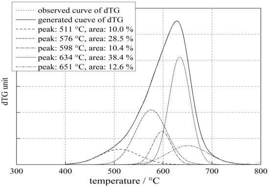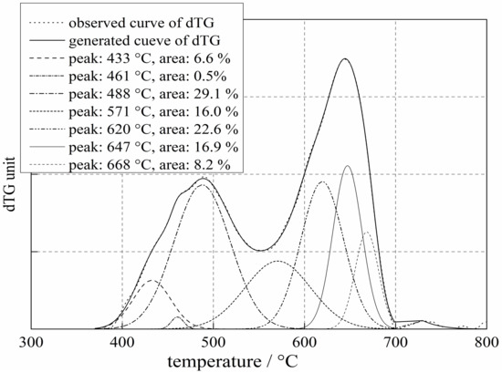 Sample XL_16_4JUP was tv/cv varieties. It contained two well resolved peaks in the cv and tv region which indicated two main dehydroxylation reactions, i.e., around 490 °C and 650 °C (Figure 8). The sum of the peak area below 600 °C (52.4%) was larger than the area above 600 °C (47.6%), even though the peak at around 630 °C was stronger than the peak at around 490 °C. Therefore, the amount of tv is larger than the amount of cv. Thus, the tv configurations dominated in this sample.