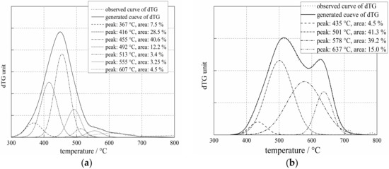 Examples of derivative thermogravimetry (DTG) curves of tv smectites. (a) Sample XL_11_NAu1 with 100% of tv layers; (b) Sample XL_14_41ValC18 with 85% of tv layers.