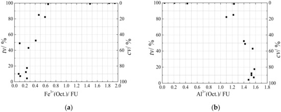 Relationship of the proportion of tv and cv layers to (a) octahedral Fe3+ content and (b) octahedral Al3+ content.