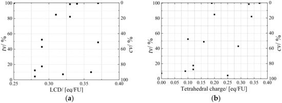Relationship of the proportion of tv and cv layers to (a) layer charge density (LCD) and (b) tetrahedral charge.