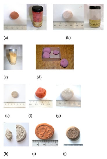 (a) Z-01405. Left: sample received, with no seal. Right: Terra Sigillata rubra, also with no stamped seals; with a label marked: Pharmaceutical Institution, Basel; (b) Z-01406. Left: sample as received. Right: Terra Sigillata alba = bolus; with a label marked: Pharmaceutical Institution, Basel; (c) Z-O1277. Powdered sample; with label marked: Alte Engel-Apotheke St.Gallen (Old Angel Pharmacy, St Gallen); (d) Z-1628. Four small samples of purple Terra Sigillata—one sample was analyzed but with inconclusive results so they are not reported here: (e) Z-01627. Terra Sigillata without stamp; (f) Z-01629-1 and (g) Z-01629-2; Terra Sigillata, with faded stamp; label on container bearing the logo of Wespi Pharmacy, Brugg; (h) sample 700.4 (white), (i) 700.17 (red), and (j) 700.18 (yellow-grey), all Lemnian Earths from the collection of the University of Basel Museum of Pharmacy (after Photos-Jones et al. [15]).