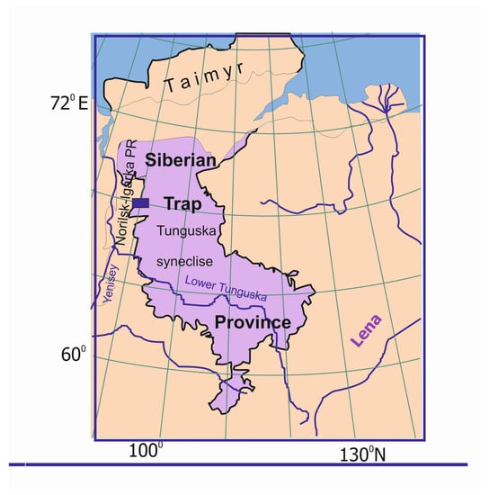 The origin of the Siberian traps province, the largest continental flood basalt province on Earth (SFBP), is still under discussion, even though it has been studies for many years [1,2,3,4,5,6,7,8,9,10,11,12,13,14,15,16,17]. A huge volume of magmatic rocks and related extra-large PGE-Cu-Ni deposits are the main points of interest for geologists [18,19,20,21,22,23,24,25,26,27,28,29]. Many different models have been suggested for its formation and the source of mineralization [5,21,30,31,32]. However, none of these models satisfies the requirements for the quality of modern constraints. The main problem arises from the lack of geological data since the SFBP is vast and comprises many remote and inaccessible areas. Nevertheless, advances in the use of geochemical data can help to improve our understanding of magmatic rocks around the Siberian province and also to reconstruct the history of their formation and evolution. By this moment, precious geochemical data were obtained for two regions of the province, Norilsk and Meimecha–Kotuy [33,34,35,36,37,38,39,40,41,42,43,44]. These data are mostly from basaltic rocks. Investigation of intrusive rocks comprised mainly the Norilsk ore-bearing intrusions [34,35,45,46,47,48,49,50], while the intrusions from other parts of the province have almost not been analyzed yet.