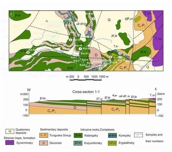 Geological map of the Kulyumber river valley (after Norilskgeology Ltd. data with the authors’ corrections).