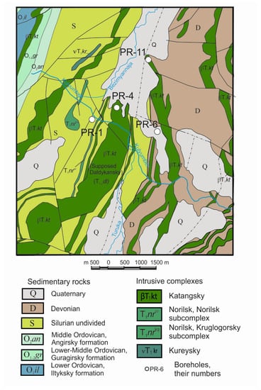 Intrusive bodies are mostly enclosed by sedimentary rocks, and are exposed in the western part of the area (Figure 1). During the geological mapping (1:200,000 scale) these rocks were classified into several complexes on the basis of their textures and structure as well as a few X-ray fluorescence (XRF) analyses. They were attributed to the intrusive complexes typical of the Tunguska syneclise (Katangsky, Kuzmovsky, [53]), the Norilsk area (Ergalakhsky, Norilsk, Daldykansky, Ogonersky) [52], and the local Kureysky complex. However, this classification does not take into account modern geochemical techniques that allow distinguishing different types of intrusive rocks more precisely.