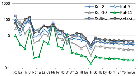 Trace-elements’ spider diagrams for sedimentary rocks of the Kulyumber river valley, normalized to primitive mantle after [58].