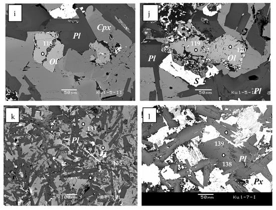 BSE images of the intrusive rocks (a,b) Kureysky complex, Intrusion 4, sample K-2 (c,d); (e–l) Katangsky complex; (e–j) sample Kul-5; (k–l) sample Kul-7. Minerals: Ol, olivine; Px, pyroxene; Cpx, clinipyroxene; Pl, plagioclase; S, sulfide. Point numbers correspond to numbers in Table 2.