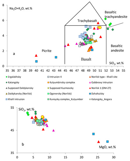 Major components. Most of the analysis (Figure 7a, Table 4) fell in the field of basalts of normal alkalinity basalts, a number of them were located in trachybasalt and basaltic trachyandesite fields, and only several points occurred in the field of picritic basalts (Dzhaltulsky massif and Norilsk 1 intrusion). A similar distribution was observed in the SiO2-MgO diagram (Figure 7b), where only some rocks had high Mg compositions (23–28 wt.% MgO) that did not belong to the Kulyumber area. Therefore, we limited further consideration of the compositions of the rocks from the Kuyumber area with MgO contents of 2–12 wt.% (Figure 8). This restriction allowed us to consider the obtained data in more detail.