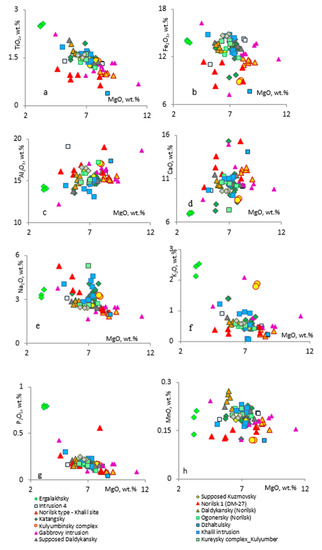 A slightly lower content of MnO is also typical of the Norilsk 1. The CaO and Al2O3 demonstrated opposite trends, i.e., they directly correlated with MgO contents (Figure 8c,d). Points of the Na2O concentrations formed two trendlines; one of them was typical of the Norilsk and Kureysky complexes and the second line characterized distribution of this oxide in other rocks (Figure 8e). The highest K2O and P2O5 contents (Figure 8f,g) were typical of the Ergalakhsky and Kulyumbinsky complexes that distinguish them from the other rocks.