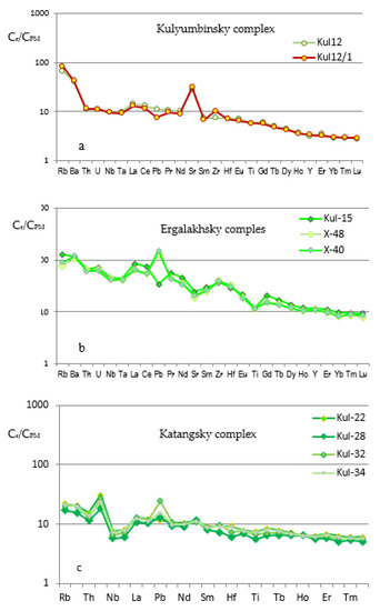 Main types of trace elements’ spider diagrams for intrusive rocks of the Kulyumber river valley. Complexes: (a) Kulyumbinsky, (b) Ergalakhsky, (c) Katangsky.