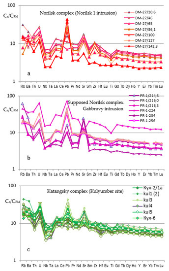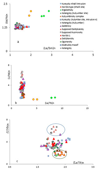 The rocks of the third group formed a wide range of compositions, varying in (U/Nb)n ratio. A more detailed examination of these rocks (Figure 11c) indicated that there were intrusions with high, low, and intermediate (U/Nb)n ratios, reflecting the most pronounced Ta-Nb anomaly, the minimum pronounced, and ordinary apparent. The highest (U/Nb)n ratio was typical of the Supposed Kuzmovsky and Supposed Daldykansky complexes penetrated by PR-4 and PR-11 boreholes. One sample from the Gabbrovy intrusion (PR-1/224) has a high (U/Nb)n ratio, as well, and occurred in the same field which supports its xenogenous origin in comparison with the other samples from this intrusion. The lowest (U/Nb)n ratio characterized the Daldykansky and Ogonersky complexes (Norilsk area), Norilsk-type intrusion in the Khalil site, and Dzaltulsky massif. The rock compositions of the Norilsk 1 intrusion, Gabbrovy intrusion, and Katangsky and Kureysky complexes formed a single field, where points of the Khalil intrusion occurred at the edge of this field.