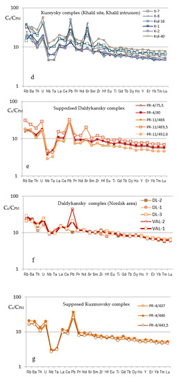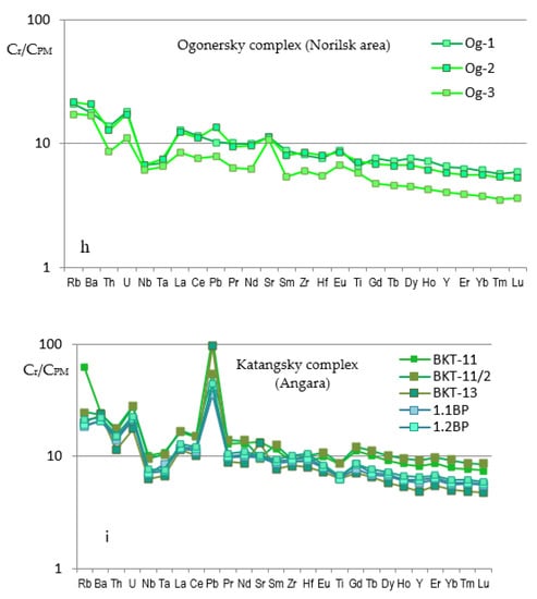 Trace elements’ spider diagrams for intrusive rocks of the Siberian platform. Data are in Table 3 and [51]. Complexes: (a) Norilsk, (b) Supposed Norilsk, (c) Katangsky,(d) Kureysky, (e) Supposed Daldykansky, (f) Daldykansky, (g) Supposed Kuzmovsky (h) Ogonersky, (i) Katangsky.