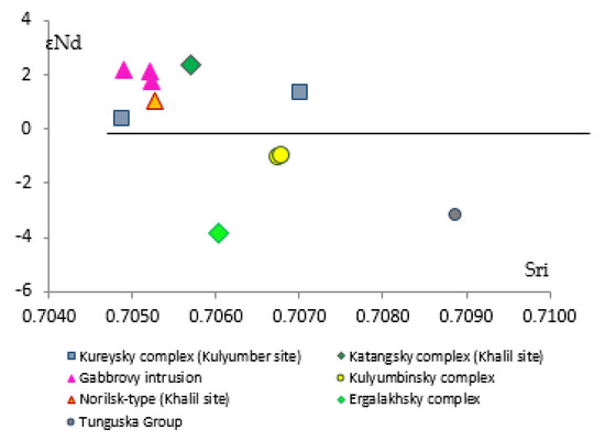 Despite these variations, the initial isotopic signatures of the samples studied were characterized by high consistency inside the intrusive complexes and, at the same time, they differed significantly between these complexes. Thus, the rocks of Ergalakhsky complex had an initial strontium ratio value (Sri) at 0.7060 and lowest epsilon neodymium value, −3.8, while the rocks of the Kulyumbinsky complex were characterized by Sri 0.7067 and epsilon neodymium at −1.0, and the Gabbrovy intrusion had the lowest Sri values, from 0.7049 up to 0.7052, and the highest epsilon neodymium, from +1.0 up to +2.2 (Figure 12). While the metasomatized sulfide-containing basalt of the Katangsky complex had initial isotopic parameters that were almost identical to the sedimentary rocks of the Tunguska Group, namely, Sri 0.7082 for basalt (X-15-2) versus 0.7088 for argillite (X-47-2) and εNd-2.7 for basalt and −3.2 for argillite. The studied samples of the Kureysky complex had the most variable isotopic characteristics, so the initial isotopic composition of strontium varied from the lowest value among the studied samples, 0.7048, to one of the highest, −0.7070. In this case, the isotopic composition of neodymium varied within 2 units of epsilon, from +0.4 to +2.3. Perhaps these variations, which are atypical for other complexes, are explained by a combination of separate intrusions genetically belonging to other intrusive complexes (e.g., Intrusion 4 and Khalil intrusions).
