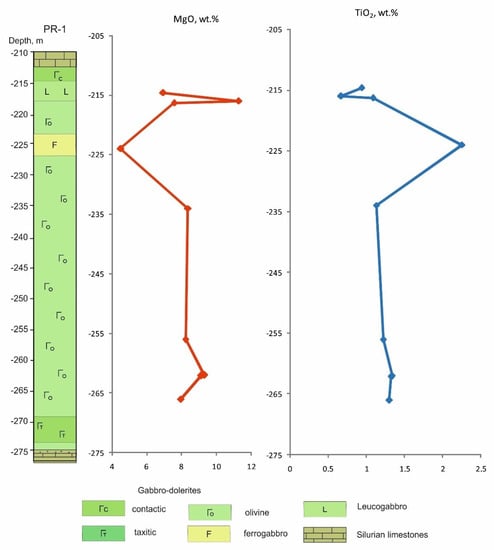 The intrusion penetrated by the borehole PR-1 at depths of 213–279 m was attributed to the Norilsk complexes (Kruglogorsky subcomplex) on the bases of the leucogabbro horizons in it and the discovery of disseminated sulfides in its lower zone (271–275 m), although it is not completely correlated with the ore-bearing intrusions of the Norilsk area. It was named the Gabbrovy intrusion. Some intrusions penetrated by boreholes PR-4 and PR-11 (Figure 4) were presumably recognized as sills of the Daldykansky (PR-4/80, PR-11/480), Ogonersky (PR-6/339), and Kuzmovsky (PR-4/430 m). We named them Supposed Daldykansky, Supposed Ogonersky, and Supposed Kuzmovsky before getting analytical data.