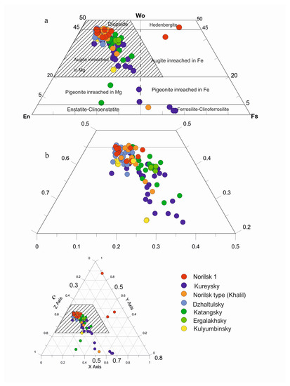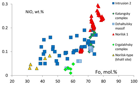 Kureysky complex. The largest intrusion of the Kureysky intrusive complex is the Intrusion 4 in Figure 3. It is formed by coarse-grained and middle-grained olivine gabbro-dolerites and gabbro-dolerites. The main rock-forming minerals are olivine, clinopyroxene, plagioclase; moreover, rare minerals are represented by biotite, magnetite, and apatite. Composition of olivine (representative analyses of rock-forming minerals are given in Table 3, full data are in Table S1) varied significantly from Fo49 to Fo75, and the largest grains have a zoned structure where border zones are enriched in Fe (Figure 6a,b). The CaO content reached 0.32 wt.%, and the NiO contents were low (0.05–0.17 wt.%). This composition strongly distinguishes from the olivine compositions of the ore-bearing intrusions of the Norilsk area, in particular, from the Norilsk 1 intrusion (Table 3 and Table S1) and other intrusions [24,25,61,62,63]. Clinopyroxene has a more stable composition. Its Mg number ranged between 64–74. Chromium is practically absent (at the level of the electron microprobe analysis (EPMA) sensitivity) and TiO2 content reached 1 wt.%. Maximum concentrations were (wt.%) Al2O3—2.25 and Na2O—0.40. The composition of plagioclase varied from An56 to An70. Magnetite contained 12–14 wt.% TiO2. The mineral composition of the Khalil intrusion (the Khalil site), attributed to the Kureysky complex, which was also studied in the samples X-19 and was close to that of Intrusion 4 in the Kulyumber site.
