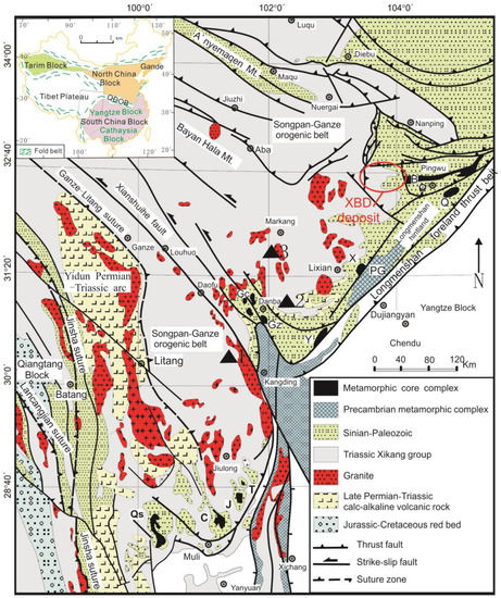 Simplified structural geological map of the Songpan-Ganze orogenic belt (map taken from [47]) with Xuebaoding (XBD) deposit location indicated.