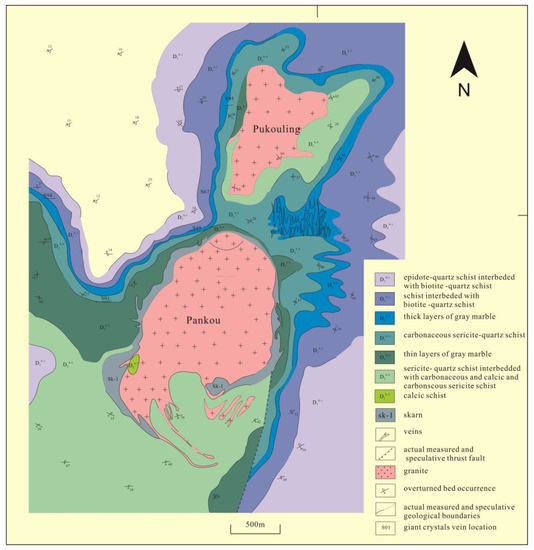 Simplified regional geological map of the Pankou and Pukouling granites, with W-Sn-Be mineralization in veins and pods in surrounding upper Triassic marble and schist of the Zhuwo series (modified after reference [52]).