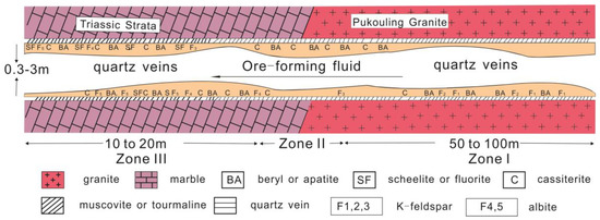 Schematic cross-section of a typical mineralized vein showing the distribution of beryl, cassiterite, scheelite, muscovite, tourmaline, albite and K-feldspar and host rock transition from granite to Triassic metamorphic strata and divided into three characteristic zones. After reference [6].