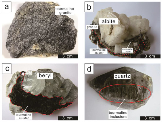 (a) Tourmaline granite from Xuebaoding, Sichuan Province, China. (b) Tourmaline cluster, coarse-graintourmaline and albite from the Xuebaoding, Sichuan Province, China. (c) Tourmaline cluster overgrown by tabular beryl in the Xuebaoding deposit, Sichuan Province, China. (d) Quartz with tourmaline inclusions from Xuebaoding, Sichuan Province, China.