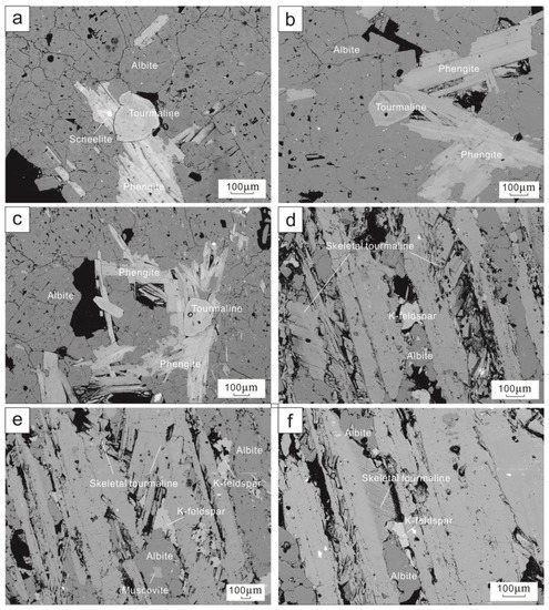 Backscattered electron images of tourmaline from the Xuebaoding deposit. (a) Type I: weakly zoned tourmaline intergrown with phengite and albite with fine-grained scheelite nearby, in the granite. (b,c) Type I: weakly zoned tourmaline intergrown with phengite and albite in the granite. (d–f) Type II: radial clusters of skeletal tourmaline hosted in ore vein.